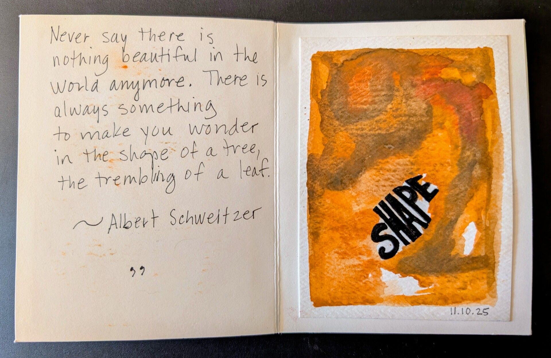The gardens certainly provided that, including inspiration for a gratitude project I’d been working on. The project was to do a small abstract watercolor to represent a gratitude each day for two weeks, letting the feelings guide the process. After visiting Longwood, I was feeling grateful for the plants and trees. As the watercolor took shape, the word “shape” came to me. Then I looked for a quote to accompany my image. What synchronicity to find the perfect gem of wisdom from Albert Schweitzer!